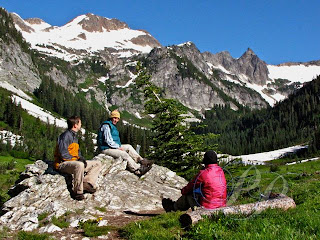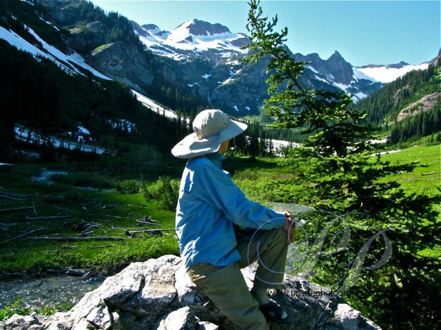 Located in the Glacier Peak Wilderness, north of Leavenworth, WA, Spider Meadow is a place that is always new, recreating its beauty year after year. Its many waterfalls–we counted fifteen–feed into Phelps Creek, the name of the trailhead that starts near a blip on the map known as Trinity. Although the area is isolated, it is popular with hikers. Fortunately the meadow provides many campsites, but it is best to avoid it on weekends. Still, all one has to do is raise one’s eyes to the peaks and waterfalls, and soak up their renewing energy in heart, mind, and soul.